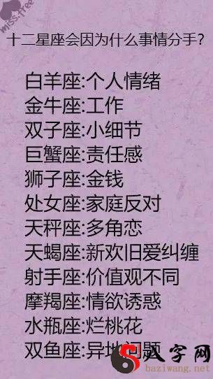 今日,我为大伙儿梳理了四个有关星座的难题:十二星座会因为什么事儿提出分手;最非常容易上当受骗的星座排名榜;